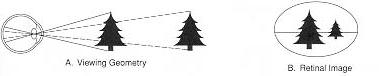 The more distant object projects a smaller size image on the retina. Let's assume that there are two objects of equal size but at different distances from the viewer (picture A). It will then be the case that