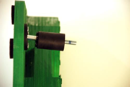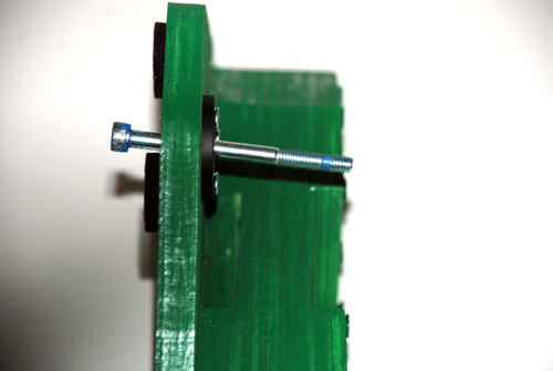 Step 2: Put long hex bolt through the hole in the base from the bottom. It should stick out of the top of the circular piece you just attached. |