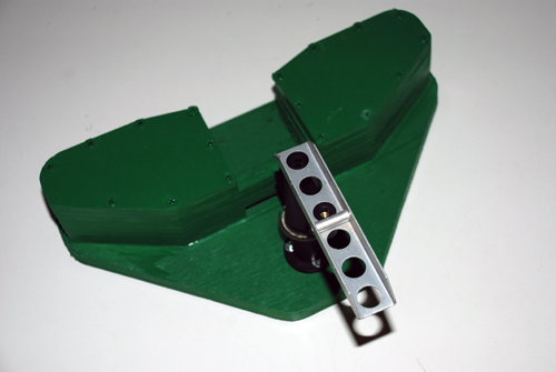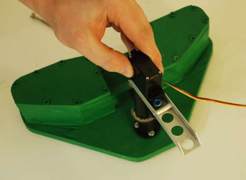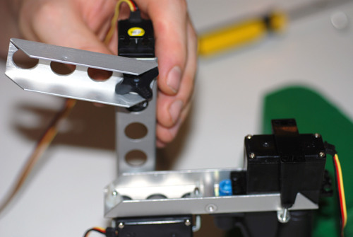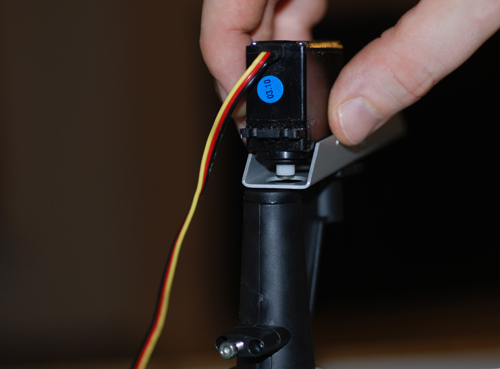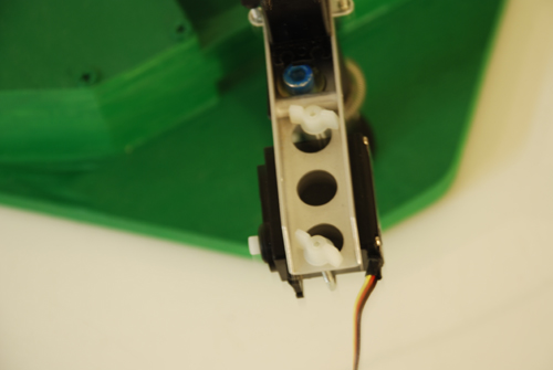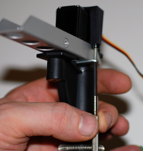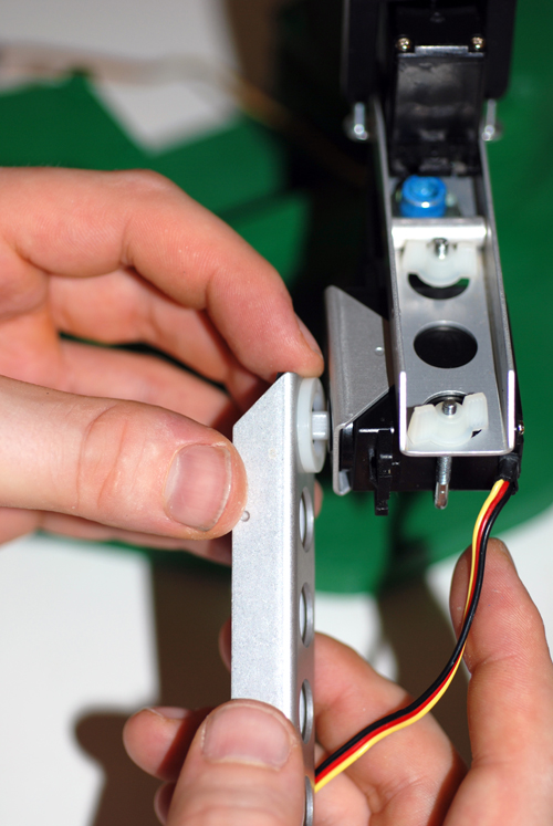 Steps 11-12: Attach the 5-hole link to the servo you just attached. Put a nylon washer between the two metal links. Tighten the screw. Again, rotate the servo to make sure it has an even motion up and down. |
