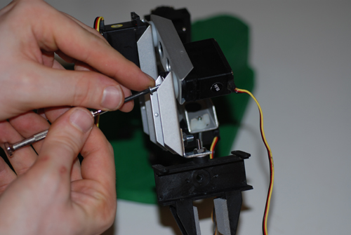 | Step 21: Attach the last servo motor into the gripper hand as shown. Make sure the arm opens and closes correctly. Note: This servo sits in the gripper hand without a screw. |