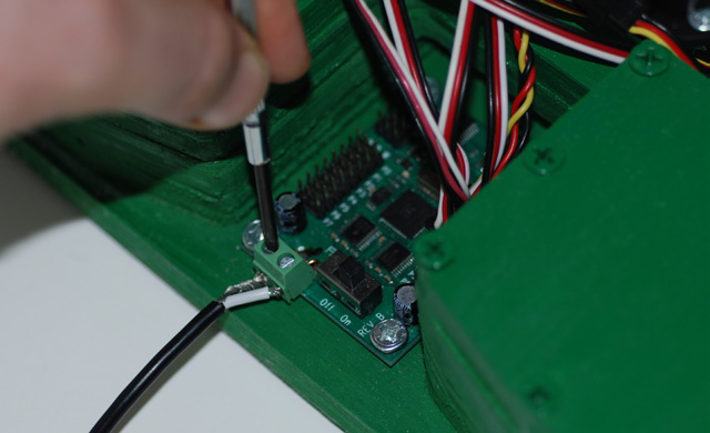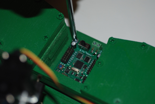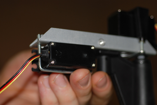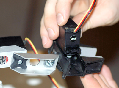 Step 9: The next piece you will attach is a standard HS-422 servo. You will need the metal cradle and the two plastic wing nuts to complete this step. |