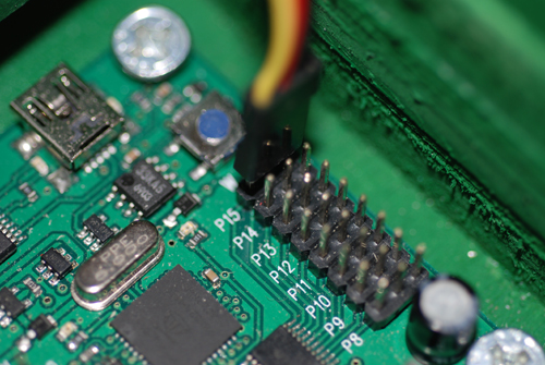 Step 25 - 26 Continue down the line, connecting the servo between the 6-hole and 5 hole support to P14, the servo between the 5-hole and 4-hole supports to P13, The servo between the 4-hole and 3-hole connector to P12, and the servo attached to the gripper hand to P11. |