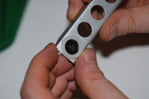 | Step 3: Attach the cylindrical pivot post piece to the circular pivot post adapter. The protrusions from the cylinder should fit in the holes on the circular piece. | |