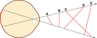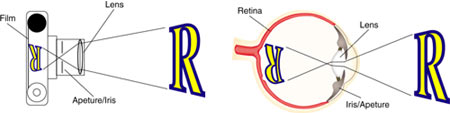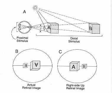 RETINAL IMAGE -- light reflects off of objects in the world, it passes through the LENS at the front of the eye and it is focused at the back of the eye. -- the LENS also flips the image upside down in the process of focussing it to a small point ![]()
